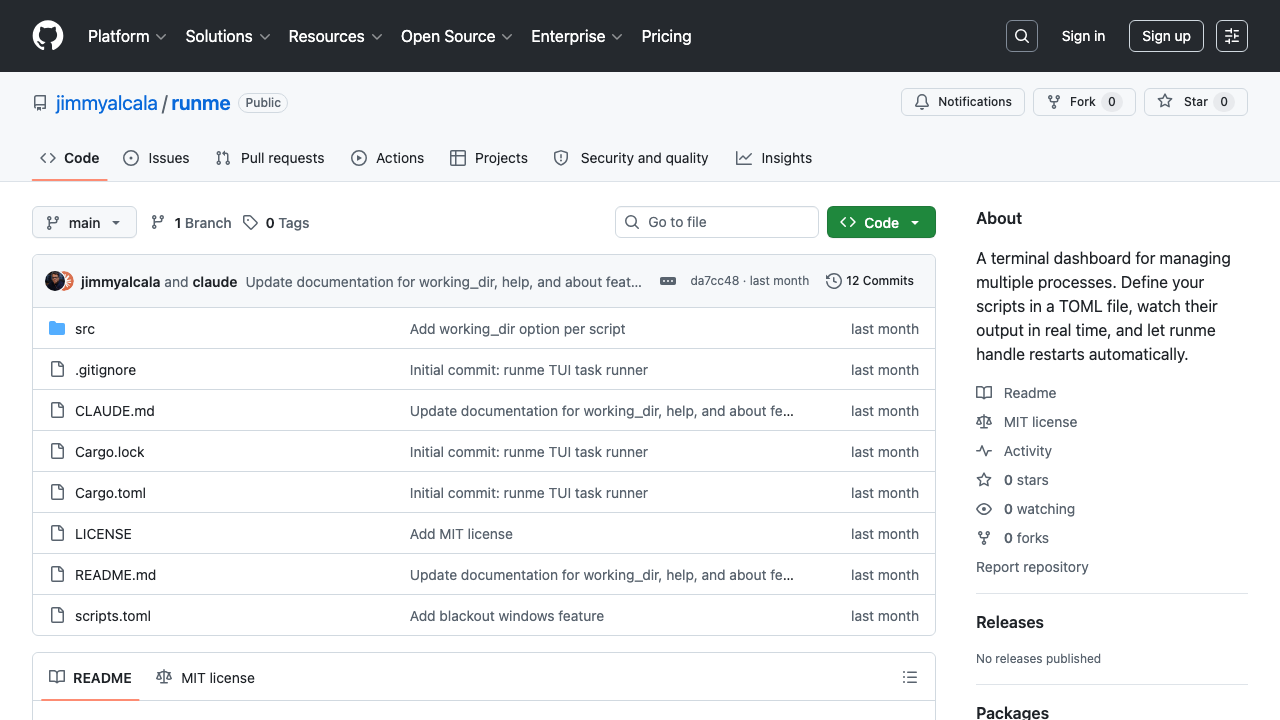 runme arregla esto. Defines tus scripts en un archivo TOML, corres runme, y te muestra todo en un dashboard. Cada proceso tiene su propio panel con salida en tiempo real. Si algo se cae, se reinicia automáticamente. Una pantalla, todos los procesos.